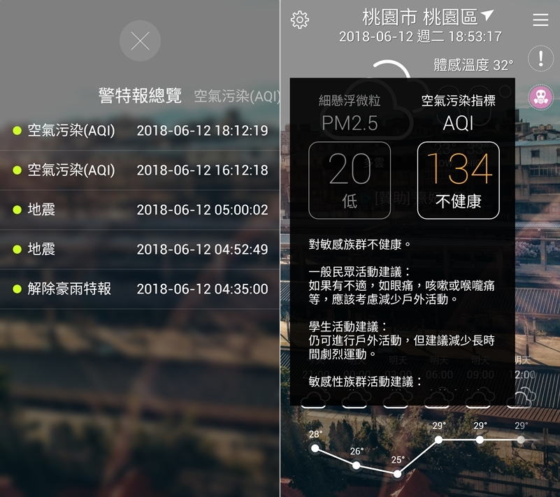 包含地震、豪雨、氣溫等各種天氣狀況和即時特報,空氣觀測的部分主要看 PM2.5 和 AQI 指標,並提供各種族群的活動建議參考。