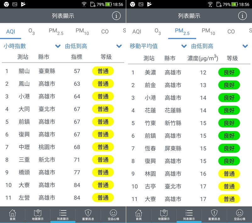 可選擇地圖或列表來顯示內容,AQI 小時指數、PM2.5 濃度等各項指標都有,也可依數值排序查看。