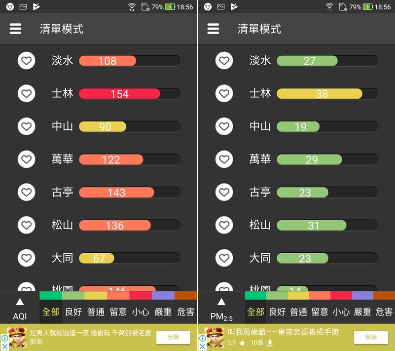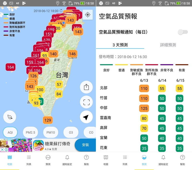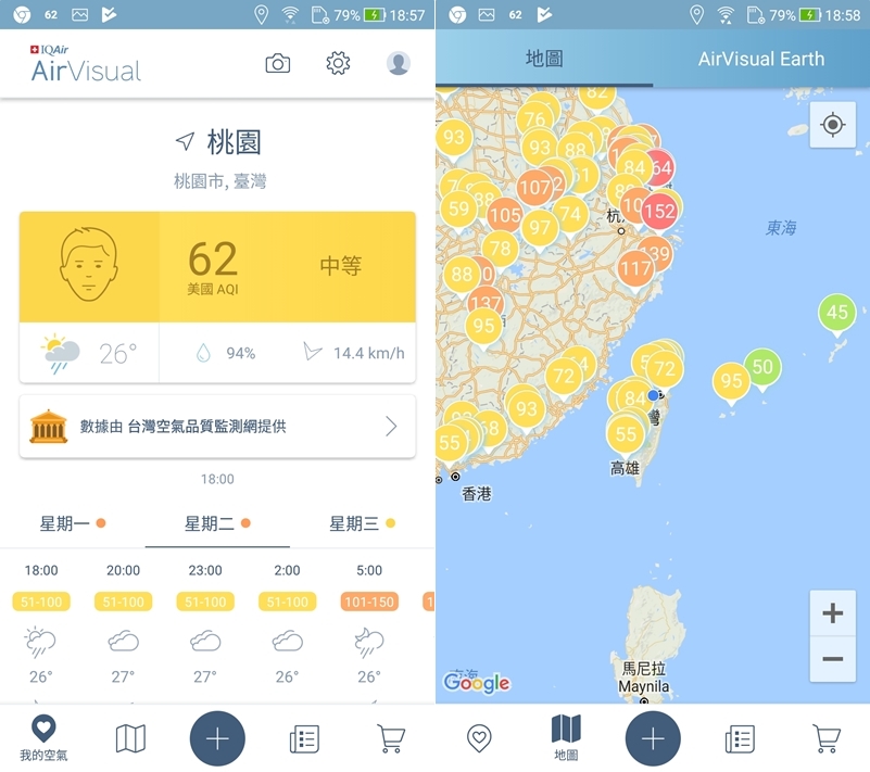 接下來幾款都是 APP,阿湯列出雙版本、評分比較高的幾款,包括這款也是阿湯有介紹過的,介面清晰好操作,可以清楚看到你在的某個確定的地區指數,也有預報功能可利用。