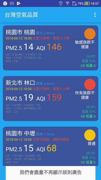 很簡單就一個頁面,除了空氣品質相關的各項指標、溫度、濕度、UV 值等,還有列出主要的汙染物,像桃園市桃園區、中壢區就分別是臭氧八小時跟細懸浮粒。