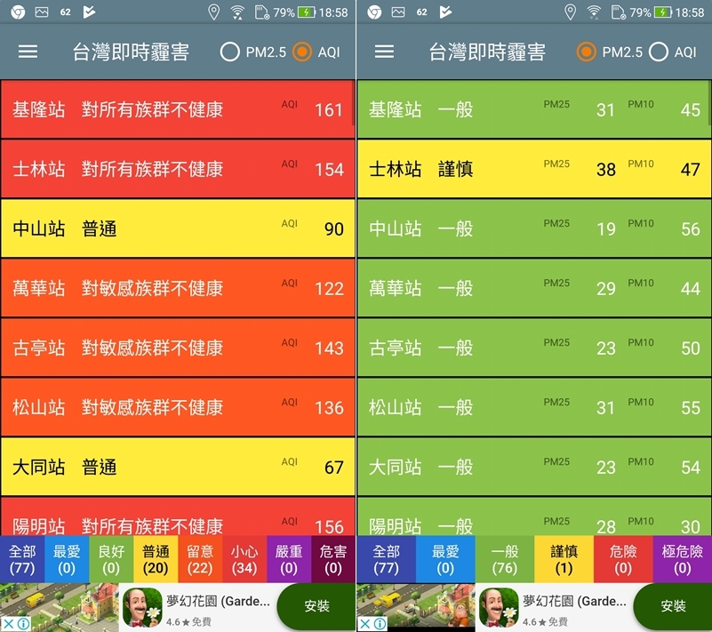 很簡單,就是 AQI 和 PM2.5 來切換看霾害,並依嚴重程度列出對不同族群的建議。