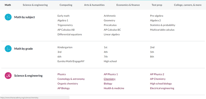 總共分為七大主題,包括數學、科學與工程、計算、藝術與人文科學、經濟和金融、檢定考試、大學及職業相關,每個主題底下再細分項目,光數學就分兩主題―以科目分或等級(年級)分。