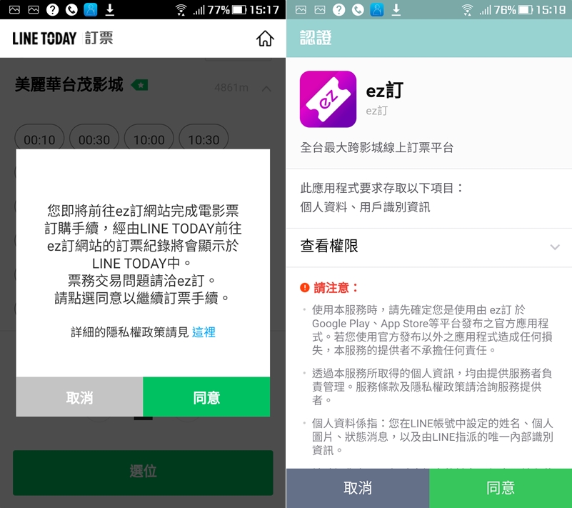 提示你即將連結到 ez 訂網站完成訂票程序,開始前會要求你同意存取權限,包括個資、用戶識別資訊。