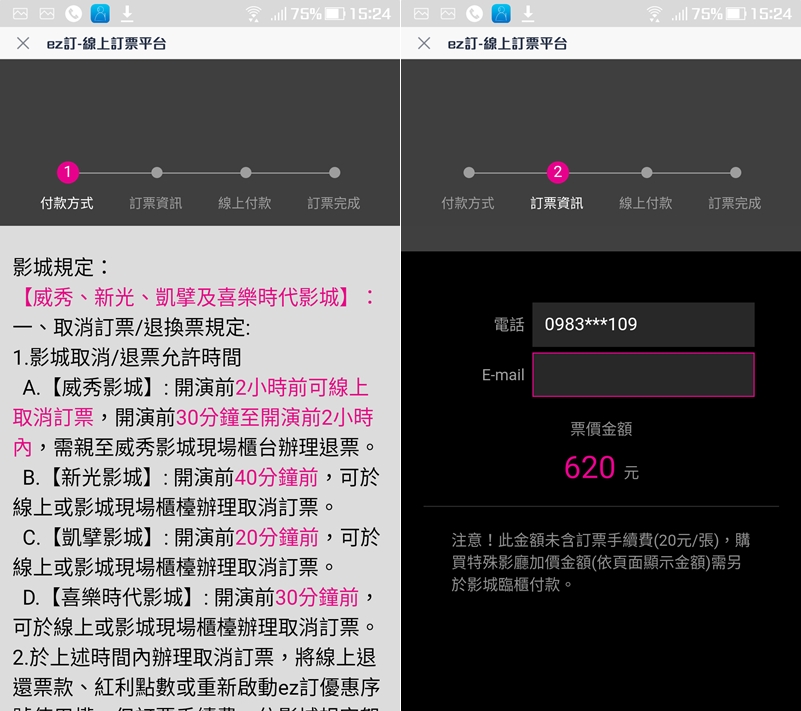 同意影城規定後,再輸入你的 Email,這個數字是未含手續費的金額,部分影城可能會加收手續費 20 元。