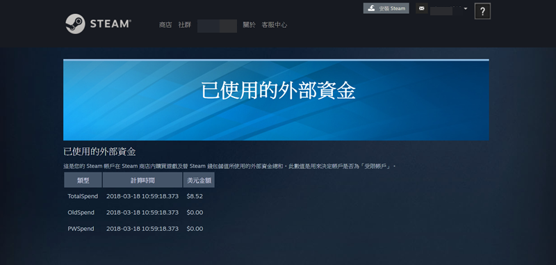 使用阿湯在最底下的連結直接進入 AccountSpend,「已使用的外部資金」表示你在商店購買遊戲及替 Steam 錢包儲值所使用的外部資金總和,此數值是用來決定帳戶是不是「受限帳戶」。