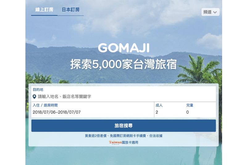 在台灣以團購網形像崛起的吃喝玩樂平台 GOMAJI,在這幾年藉著各式各樣頻道與多年耕耘所累積不少用戶的優勢,現在更進一步在旅遊住宿頻道中為台灣人推出了國內訂房服務!GOMAJI 與全台超過 5,000 家以上的品牌飯店攜手合作,推出以全中文介面與可支援國民旅遊卡等特色挑戰如 agoda、Hotels.com 等線上訂房平台,現在更是還有買貴退兩倍差價以及贈送 10% 點數的活動來吸引 GOMAJI 的用戶的加入!