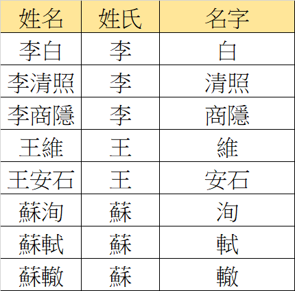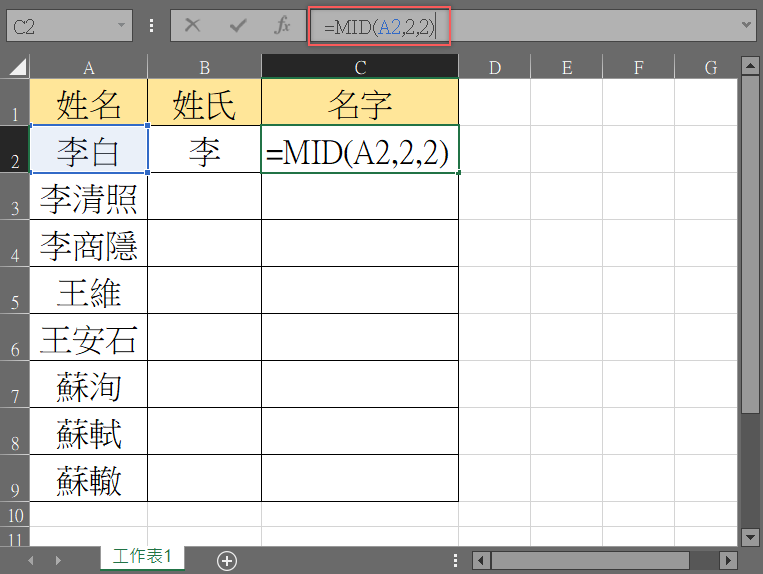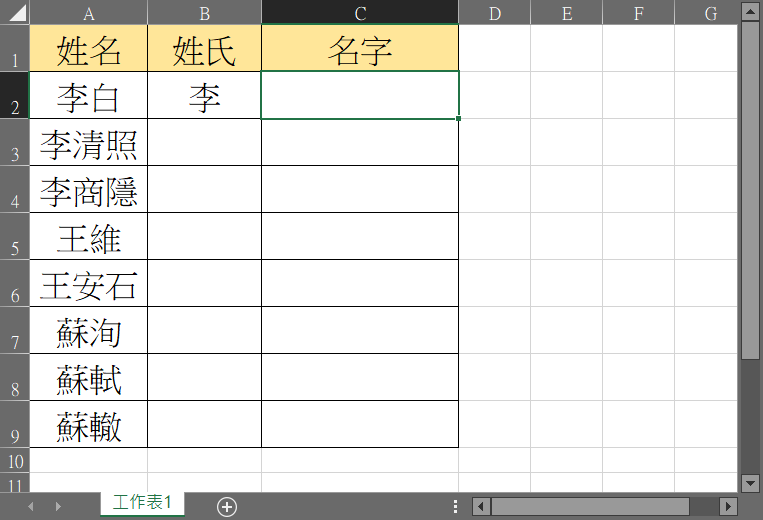 下面這些古代文人大家應該多少有聽過,古人很喜歡取單名,現在台灣人比較少見,但只要有出現在你的表單就是要一起處理,開始吧,在姓氏這欄第一格輸入公式: