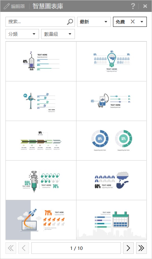 馬上來看最有趣的智慧圖表庫,如果不想看付費版,建議右上角切換成免費,光免費的圖表就有上百種可挑選,都挺特別的,就看你會不會用了。