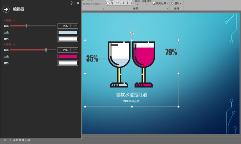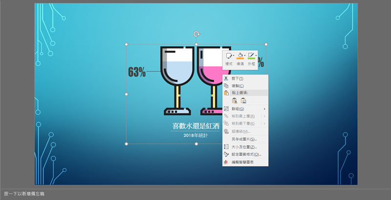 像這款酒杯樣式,先在底下更改標題及敘述,然後選取圖片按右鍵 → 編輯智慧圖表。