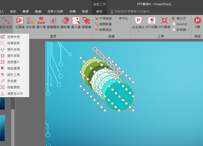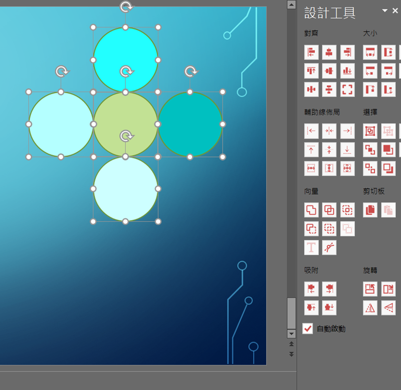 如果想自己從頭設計也是 OK 的,例如畫一個圓形後 Ctrl+C 大量複製,並填上不同色彩,然後點進設計排版的功能選擇想要的編排方式,例如環形佈局。