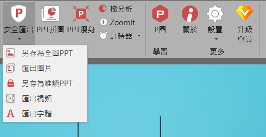 最後看怎麼匯出吧,可以存成全圖 PPT、唯讀 PPT、圖片、視頻,檔案內的字體也能匯出。