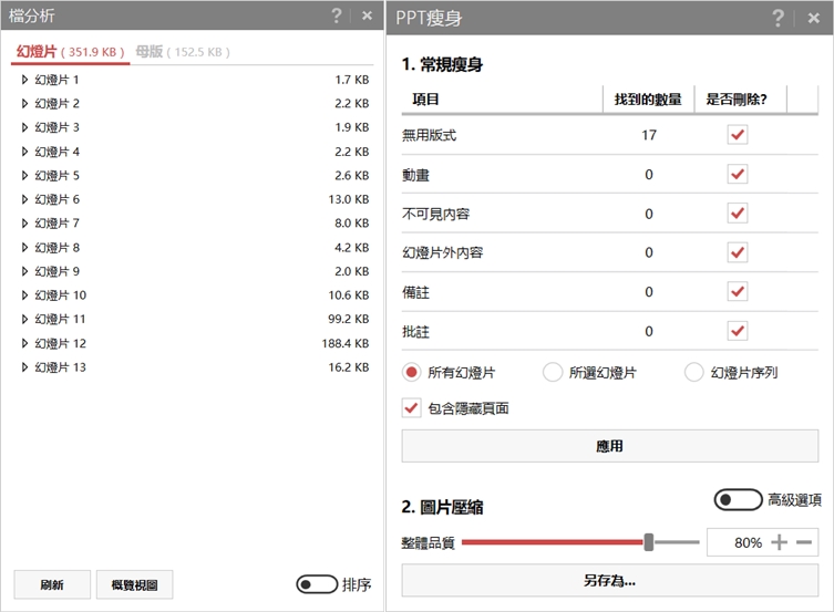 檔案太大的話可以使用分析,看每張投影片和母版所佔的空間,也能使用瘦身功能挑出要剔除的部分,並壓縮圖片,大家試試看。