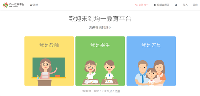 這個 2012 年創立的網站,目前(2018 年)已經有 115 萬人註冊,共 1 萬 3 千多部影片,4 萬多個練習題,內容真的是相當的龐大,先選擇你是教師、學生或家長進入。