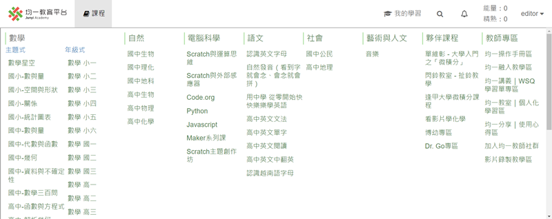 按左上角展開課程,共有數學、自然、電腦科學、語文、社會、藝術與人文,還有夥伴課程及教師教區,內容大致上從小一到高中,以及出社會可用到的一些技能,都能線上學習。