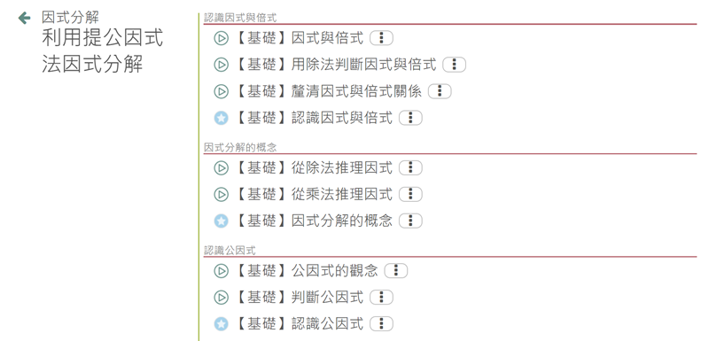 以數學來說有分主題式和年級式,來看國中數學代數與函數這門課程,共八個章主題,點進去還有再細分章節。