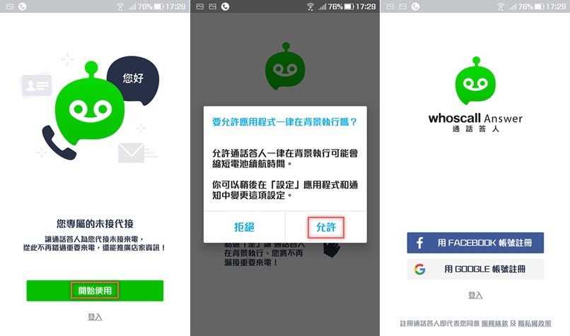 這款 APP Android 和 iPhone 兩種版本都有,按「開始使用」要求同意背景執行,如果拒絕就無法運作,點允許,不確定的話之後可再更改設定,再選擇使用 Facebook 或 Google 帳號登入。