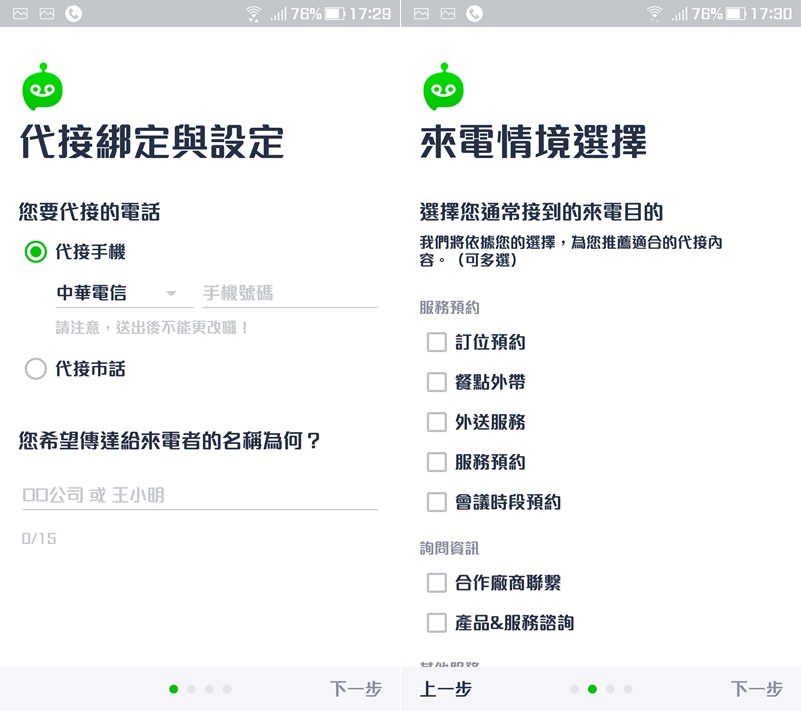 雖然是 APP,但也可以綁定市話,大家主要還是會用在手機吧,選擇電信業者後輸入號碼以及傳達給來電者的名稱,並選擇情境,包括預約、洽詢或自訂,系統會依選項建議代接內容。