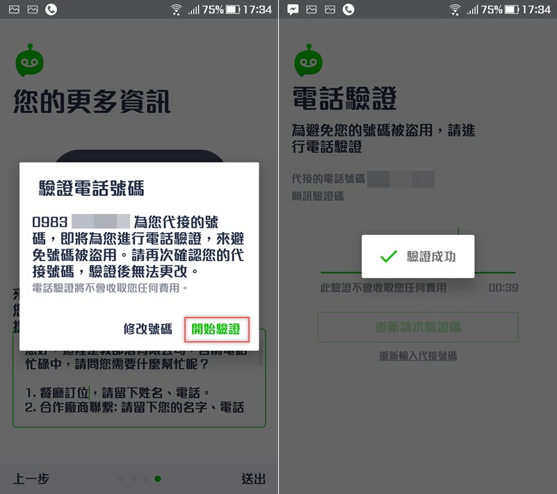 確定後送出,需要驗證電話號碼避免被盜用,收到簡訊後輸入驗證碼即可。