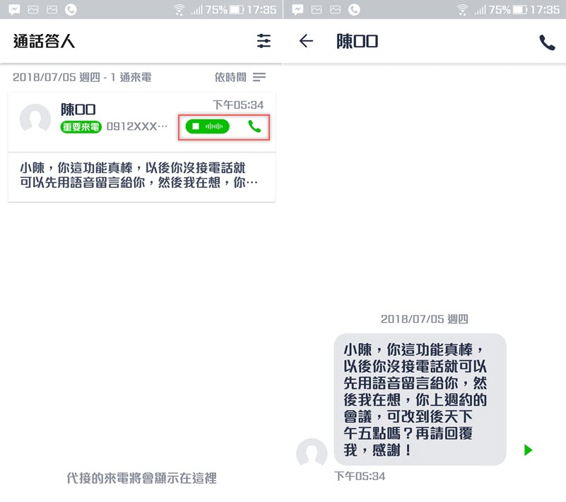 最後再開啟「未接來電自動代接」功能就完成了,代接來電會收錄在清單中,並顯示名稱、電話號碼和來電時間。