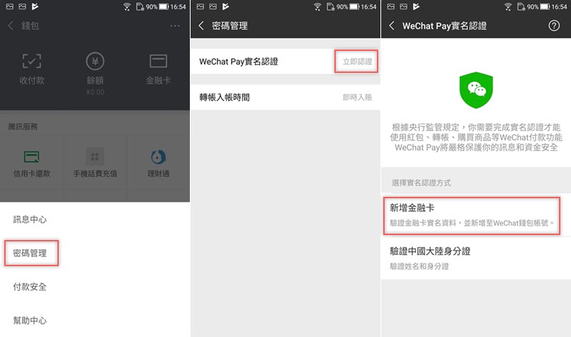 選擇密碼管理 → WeChat Pay 實名認證「立即認證」→ 新增金融卡。