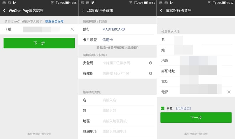 輸入卡號後,確認銀行卡類型並填寫詳細資訊、帳單寄送地址,同意用戶協定後送出。