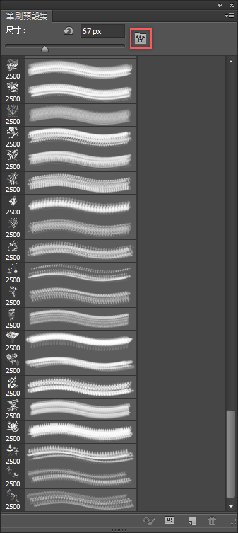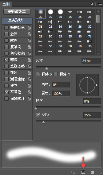 打開 Photoshop 進入筆刷功能,點最底下紅色箭頭指的按紐。