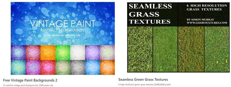 網站的其他資源也千萬不要錯過,像左邊的彩色油漆背景和右邊的青草圖樣,都可供免費下載,快速收集吧。