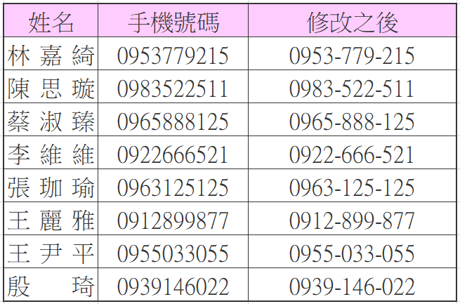 假設我們要將連續的手機號碼,修改成分三段來顯示,怎麼辦呢?