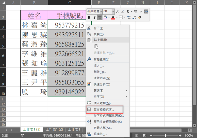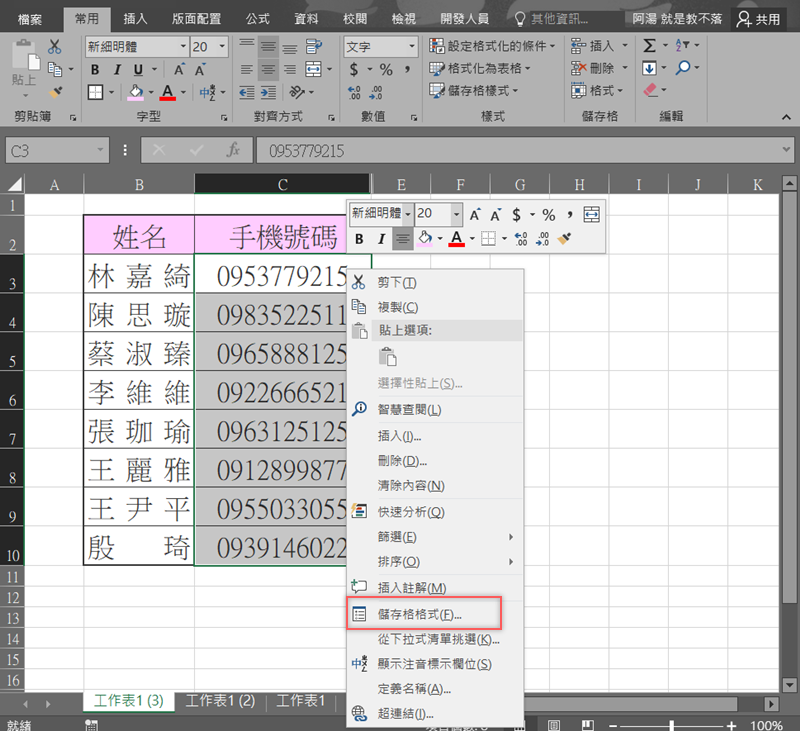 第一種狀況的前提是,還沒有處理「號碼第一個 0 不見」的這個情況,選擇整欄後右鍵 → 儲存格格式。
