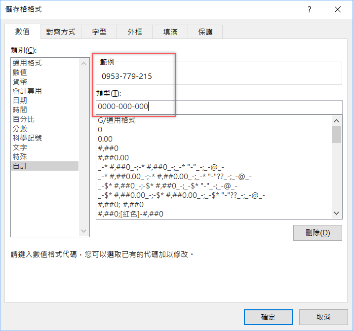 切換到「自訂」類別,在類型的地方輸入或直接更改其他項目,變成「0000-000-000」,在你輸入的同時,上面的範例也會一起變更。