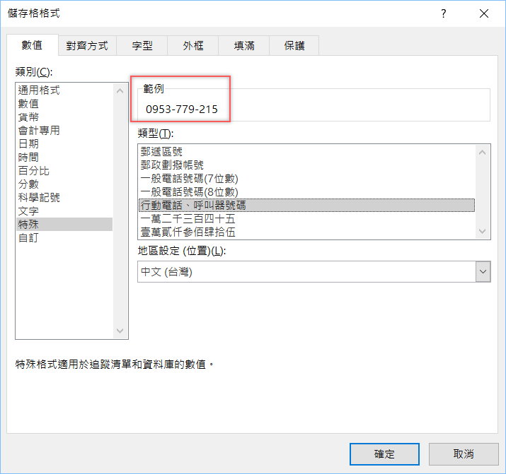 或是切換到「特殊」,在底下選擇「行動電話、呼叫器號碼」,就可以看到範例改變了。