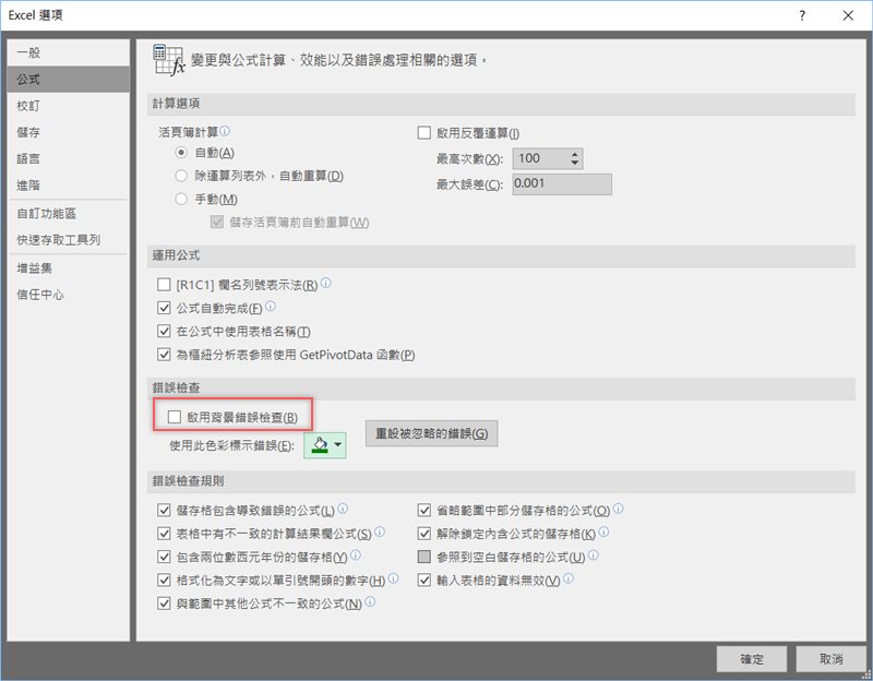補充說明,正常來說當你將號碼那欄的格式改成「文字」,格子左上角就會出現綠色的標記,可以進入選項 → 公式 → 錯誤檢查,將「啟用背景錯誤檢查」這條取消勾選,就不會顯示礙眼的綠色啦。