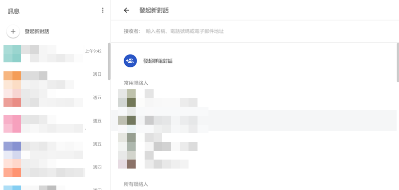 點+發起新對話,可以選擇單人或群組,輸入名稱、電話或 Email 就會自動找到你要傳送的對象,還蠻智慧的。