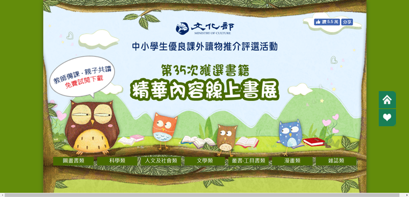 Epic!」來得多,有點可惜,所以今天再加碼介紹同樣是文化部推出的「中小學生優良課外讀物推介評選活動」中,精華內容的線上書展,包含科學、人文及社會、文學、叢書及工具書,以圖畫書、漫畫、雜誌等形式提供線上試閱及下載,很適合教師備課、親子共讀利用。
