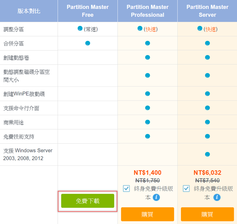 試用版功能大致上只有調整分區和合併分區,但實際安裝會看到更多細節,沒有試用期限,先用用看再考慮升級也不遲,點免費下載。