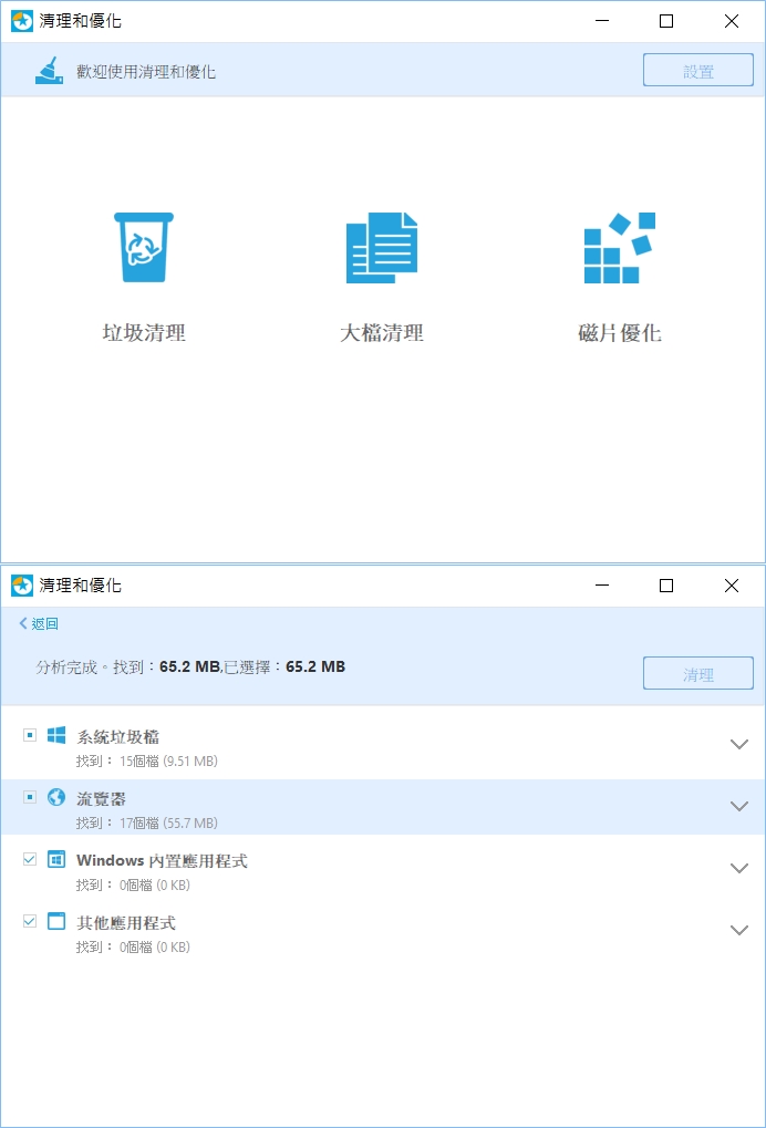 附屬的清潔功能,可以清理垃圾、大檔或優化磁片,點進分析後就能查看結果並清理。