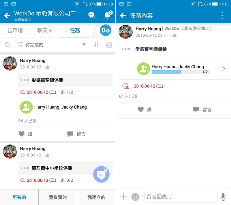 這邊的內容應該都是大家拿來測試用的,先來看任務區,顯示方式跟臉書塗鴉牆有點像,就是 PO文然後大家可以點讚或留言,並進入查看細節。