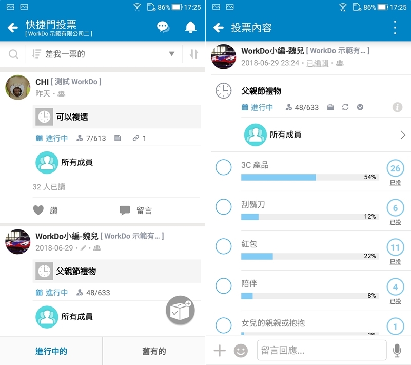 看一下有哪些進行中的投票,例如父親節禮物,設定時間、選項就能邀請成員,大家再點選要投哪個項目,同時也會顯示目前票選狀態。