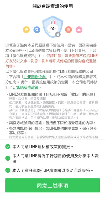 就是下面這張圖,基本上版本更新後進入就會跳出這頁,因為大家都讓系統自動更新,所以突然出現也不意外,重點就是得同意三個項目:隱私權政策變更、基於行銷目的分享本人資訊、分享優化服務資訊。