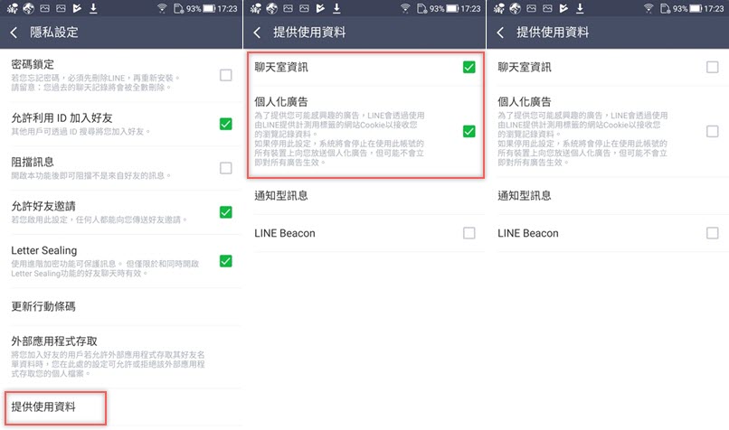 找到提供使用者資料,將「聊天室資訊」「個人化廣告」這兩項取消勾選即可。