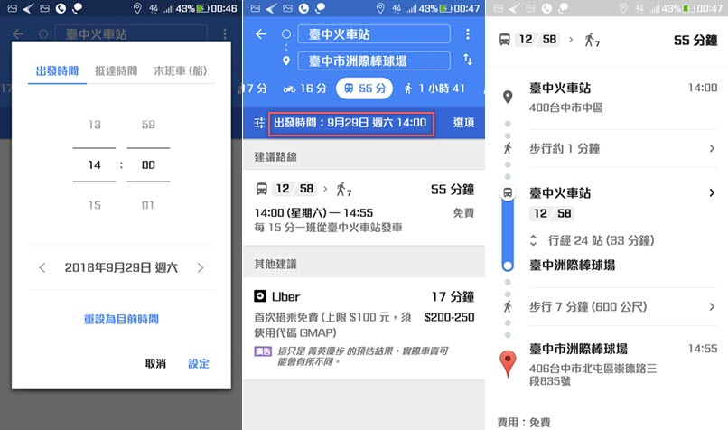預計什麼時間要出門,想知道那時的交通狀況、有什麼車可以坐,可以在設定好起訖地點後切換到大眾運輸工具,再輸入出發時間/抵達時間/末班車(船),完成後就能查看可以坐幾點的車、花多少時間到目的地。