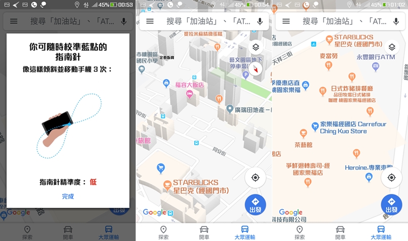 這個應該是蠻冷門的功能,如果想檢視建築物的立體形狀,可以點地圖右下角的指南針,每點一次就改變不同的方向,另外像一些大賣場如果拉近看,也會看到內部有哪些店家,不用連到賣場官網查。