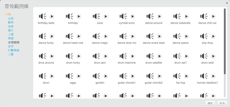 範例庫的內容相當多啊,有動物和人聲、各種樂器,可切換分類一個個點來聽聽看。