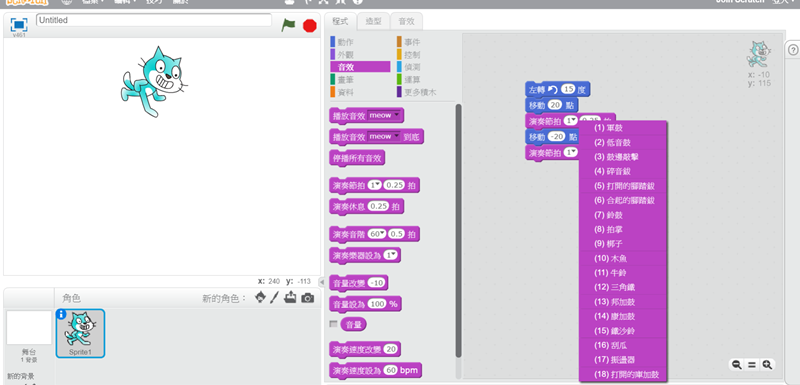 回到程式區,先拖個演奏節拍進去(對了,所有步驟都是阿湯隨便用的,大家不一定要照抄,可以自己玩)。