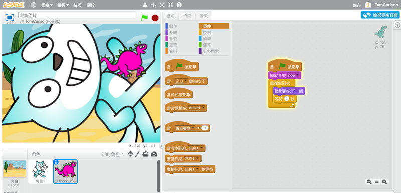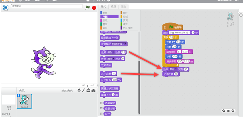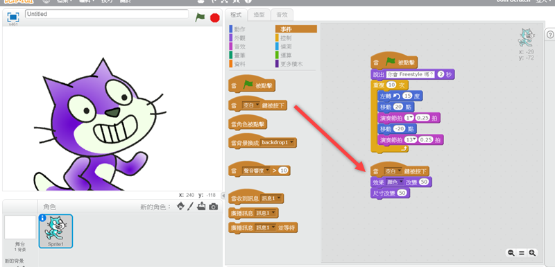 阿湯在中間再次加入移動指令,讓這隻貓咪可以隨著節拍移動,並點擊預覽。