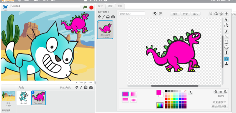 再加入第二個角色,從範例庫放一隻小恐龍進去,也來換個顏色。