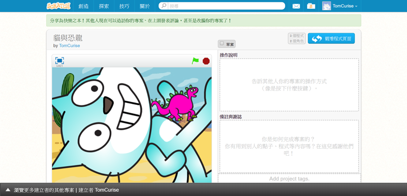 雖然網站表示是專為 8 到 16 歲的孩子設計的,但其實使用者涵蓋了各學習階段(從國小到大學)、領域(數學、計算機科學、語言藝術、社會研究…),並已翻譯成 40 種以上的語言,在超過 150 個國家上被使用,大家真的要來認識一下,首頁可觀摩其他人的作品,或直接點那隻貓試用。
