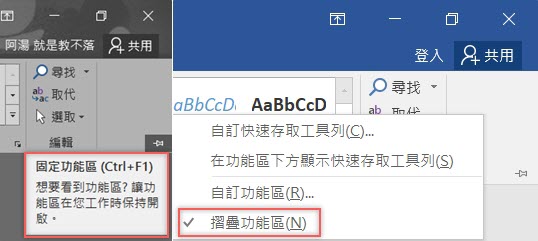 有些時候我們需要用一些小技巧來集中注意力,例如調整上排的「功能區」,當你文字越打越多擠滿了畫面,或是包含圖片表格等亂七八糟的東西,可能會需要更清爽的版面來釐清思緒,這時候我們可以取消固定,改以摺疊的方式讓功能區自動隱藏,需要的時候再點擊頁籤讓它出來。