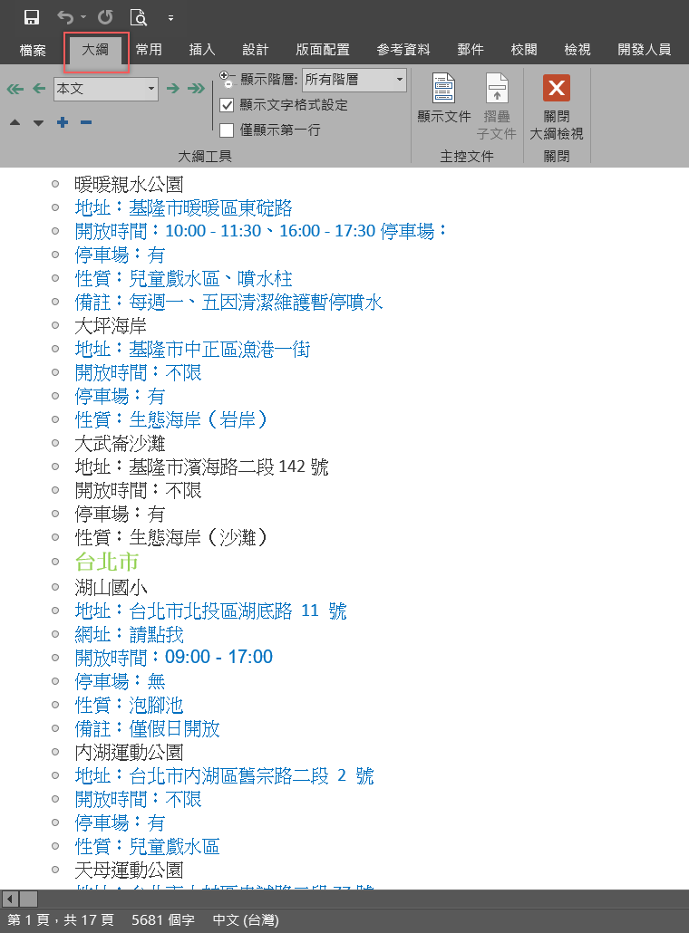 如果你的文件內容相當長,編輯起來一定更加不容易,這時候可以在檢視的地方選擇「大綱模式」,再經由分層和重新排序來編輯你的大鋼,這樣的模式也可用在找特定的內容,快速建立草稿或格式化,增進工作效率。
