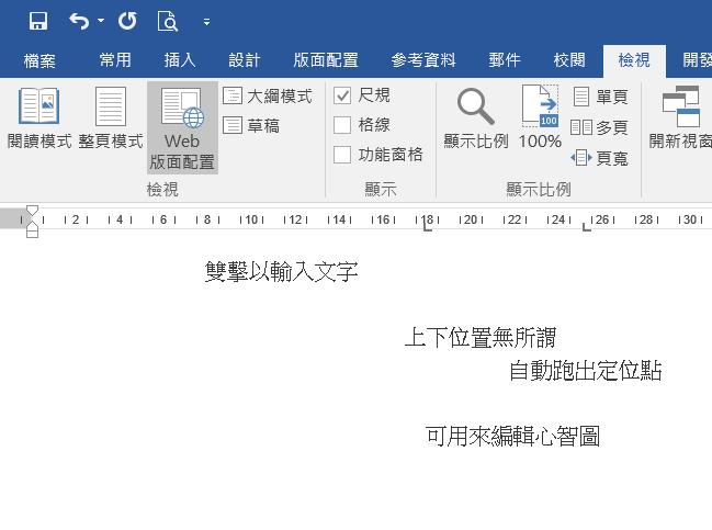 這個功能比較不好示範,簡單來說就是你可以把 Word 當作草稿,這種草稿是相當自由的,只要在頁面上點兩次左鍵(尺規有開的話同時也會出現定位點),就可以輸入文字並不受「位置」的限制,也就是說你可以將頁面當作繪圖區的畫面,進行心智圖或各種圖表的繪製,隨興的編輯可能會激發更多靈感,不過這一切都要在 Web 版面配置下才能使用。